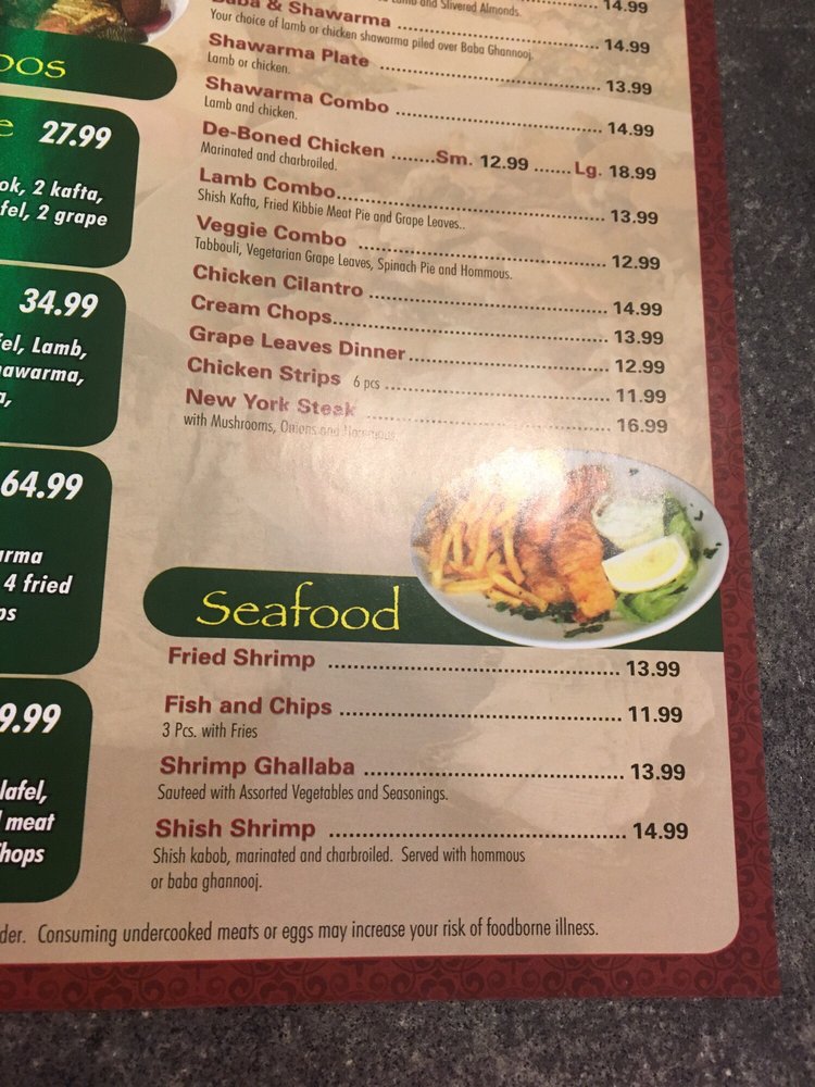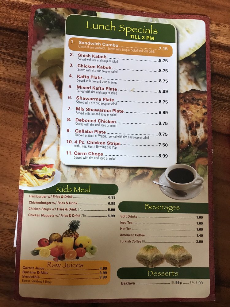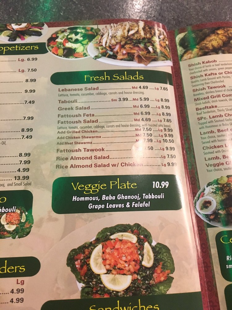 Hommous, baba ghannooj, tabbouli, falafel, lamb, grape leaves, fried kibbeh, chicken shawarma, lamb shawarma, meat pie, shish tawook, shish kafta, large salad or fattoush.