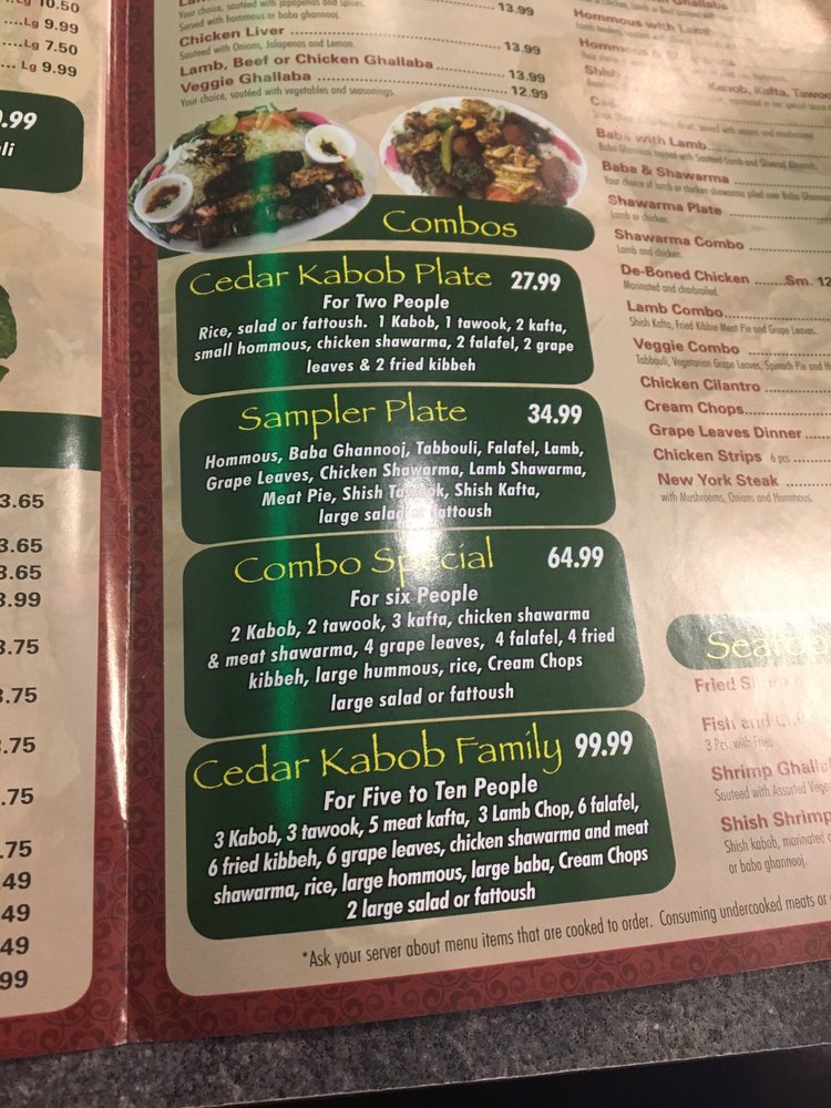 3 kabob, 3 tawook, 5 meat kafta, grilled deboned chicken, chicken shawarma and meat shawarma, rice, large hommous, large baba, cream chops, small tray salad or fattoush. For 5-10 people.